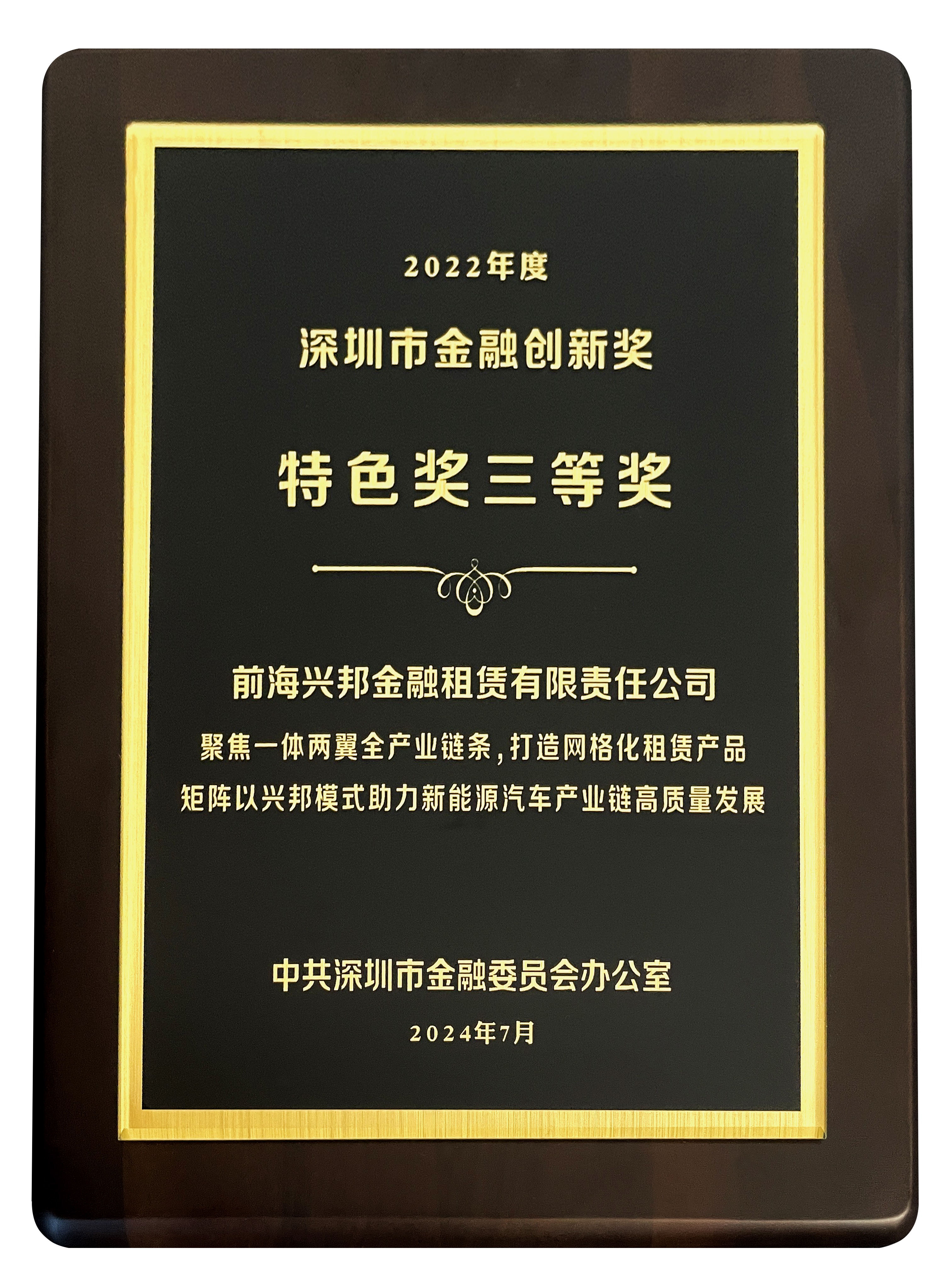 为打造深圳金融创新奖品牌影响力,向社会各界展示深圳金融创新的最新成果,2024年7月14日深圳市委金融办在市民中心B区多功能厅举办“2022年度深圳市金融创新奖成果展示会”,前海兴邦金融租赁有限责任公司荣获“2022年度深圳市金融创新奖”特色奖三等奖。